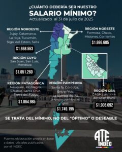 Según un informe actualizado por ATE INDEC, un trabajador con familia tipo (pareja con dos hijos en edad escolar) necesitó en julio de 2025 un salario de 1.906.092 pesos para cubrir los gastos mínimos, cifra que incluye 652.632 pesos destinados a la canasta alimentaria y 1.253.460 pesos para otros bienes y servicios esenciales. En contraste, el salario mínimo actual apenas supera los 322 mil pesos, evidenciando una pérdida significativa del poder adquisitivo.