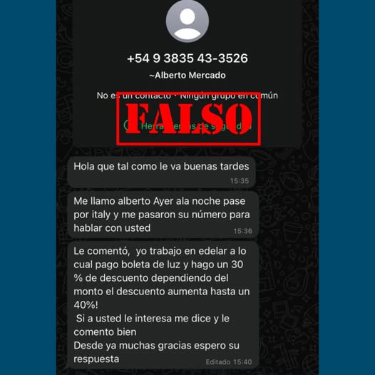 La empresa Edelar advierte a sus usuarios sobre la circulación de mensajes fraudulentos en los que personas que se hacen pasar por trabajadores de la compañía contactan por WhatsApp ofreciendo descuentos inmediatos en la factura de luz.
