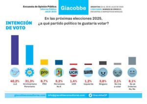 Pese a este contexto, La Libertad Avanza sigue encabezando la intención de voto a nivel nacional con un 40,2%, según la encuesta. Le siguen el kirchnerismo con un 31,3% y el PRO, como fuerza separada, con un 6,7%.