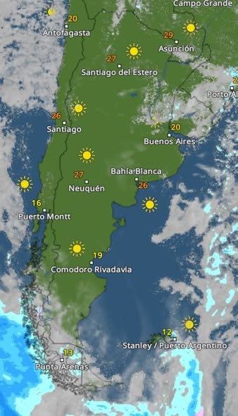 Puede ser una imagen de mapa y texto que dice "33° 19° 30° 15° San Miguel de Tucumán Cataratas del Iguazú 32° 16° 25° 15° 29° 14° Córdoba Santa Fe Mendoza 20° 12° Buenos Aires 16° 8° 33° 16° Neuquén Mar del Plata 24° 12° Viedma 28° 8° Esquel 21° g° Comodoro Rivadavia 15° 8° El Calafate 21° 6° Río Gallegos 11° 5° Puerto Argentino 12° Ushuaia"