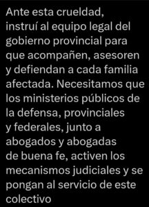 Quintela explicó que instruyó al equipo legal del gobierno provincial para acompañar, asesorar y defender a cada familia afectada, y destacó la importancia de la coordinación con ministerios públicos de la defensa, tanto provinciales como federales, junto a abogados de buena fe, para activar los mecanismos judiciales que protejan al colectivo.