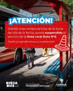 Debido al deterioro y al estado desfavorable de los caminos, se informó la suspensión del servicio rural con destino a la Ruta Provincial Nº 6 durante la tarde de hoy. La decisión fue tomada de manera preventiva ante las dificultades para la circulación, con el objetivo de resguardar la seguridad de pasajeros y trabajadores del transporte.